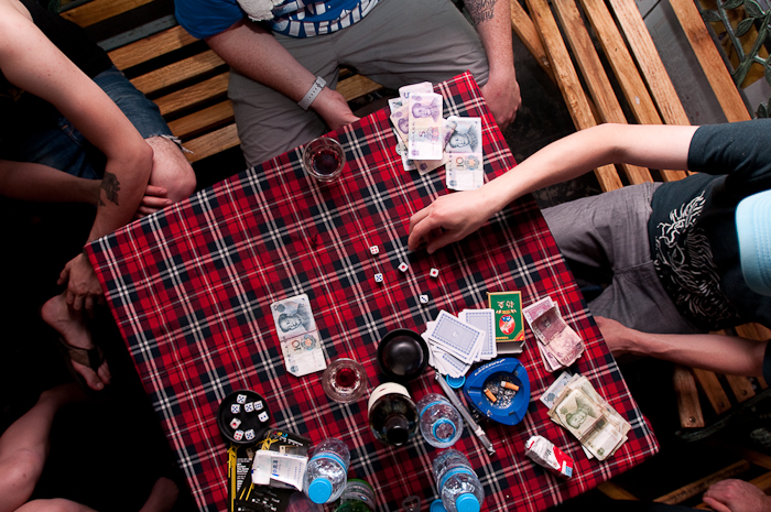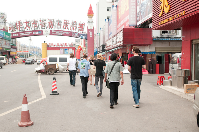 During soundcheck at the club, John Doherty and Anthony Carone of illScarlett and James Bunton of Ohbijou engage in a friendly gambling dice game. Dice games are quite popular in China and you can often find cups and dice on the tables inside bars and clubs. With everything set up and ready to go for the evening performances, a large group head down a small alleyway near the hotel, where we find a very small, local restaurant. It's more of a kitchen than a restaurant. There's no sign on the door and a few tables are scattered on the main floor. The hosts lead us upstairs to a tiny room with one large banquet table for our group. There's one fan for the room and the air conditioner doesn't appear to be working. Tour manager Dostav and the sound technician Marcel both speak Mandarin, so they order for us and the food arrives quickly and in large quantities. There's a sweet barbecue pork dish, bean curd and green vegetables for the vegetarians, noodles and soup. The dishes are simple, but they taste amazing. We leave stuffed and happy. As we do, one of the ladies tells Marcel that it is a huge honour for them to have a room full of foreigners eat there. We are honoured too...