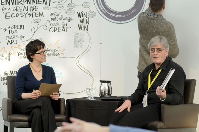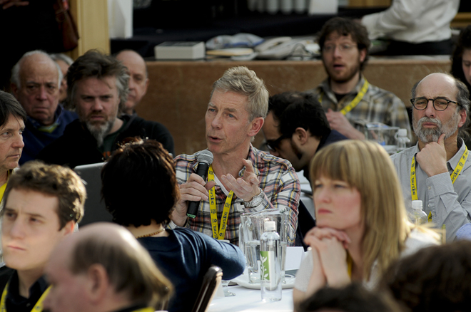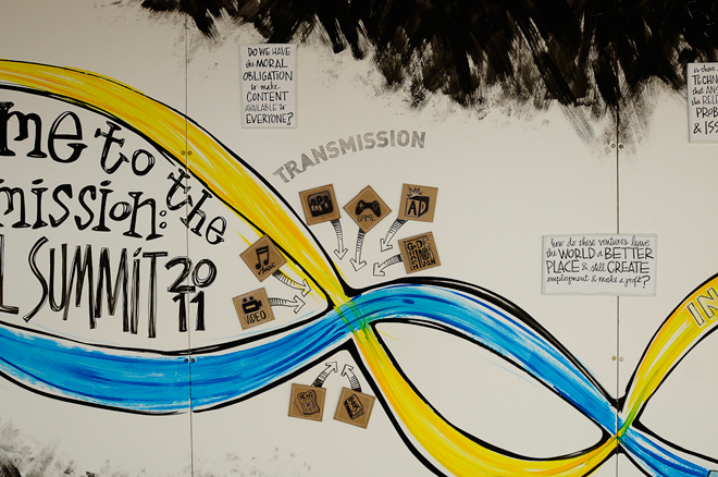 12:14 PM – I’m at a table discussing ideas about the future of digital media – how to develop financially sustainable options for creative industries. Of course there’s no way we’ll ever solve the problems in an hour, but the process is fascinating and is really why transmission exists at all.