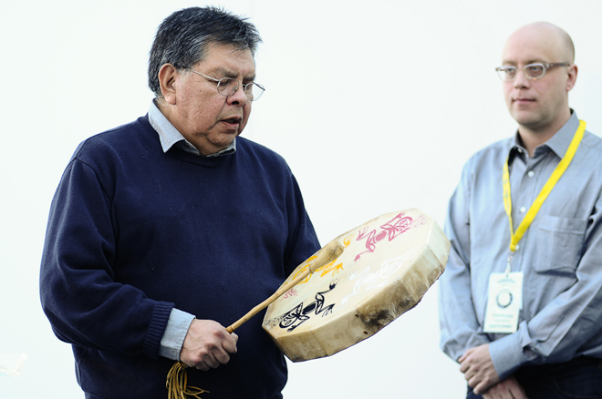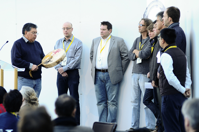 10:04 AM – Nora Young, host of CBC program, Spark, and Master of Ceremonies at transmission, takes the podium and now, really, the conference begins. Young passes through some of the minute details, protocols, etc., with precision and speed, before passing over to Butch Dick, a member of the Coast Salish First Nations, who welcomes all the delegates to his territory.