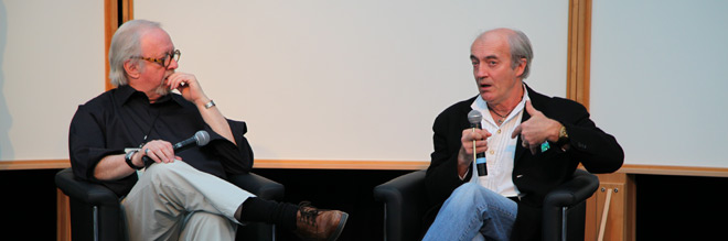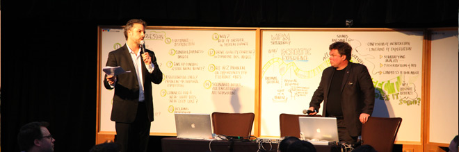 After launching the conference with a speech from Butch Dick, a representative from the local Songhees First Nation who granted TGS 2012 permission to use the traditional land, Michael Enright took the stage. Venerated journalist and host of the CBC Radio One program, The Sunday Edition, Enright was joined by Bill Buxton, Principal Researcher at Microsoft Research.