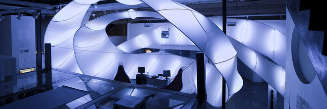 // Attending events with innovative young entrepreneurs presenting their latest start-ups? Why not do it at the centre of China's hottest contemporary art district in a gallery with a 50 foot glass bottomed, lap pool suspended from the ceiling?