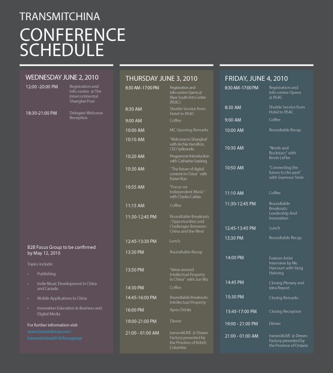 transmitCHINA conference: Three days of round table discussions, keynotes presentations and receptions that connects Canadian and International music, technology and media professionals to leaders, thinkers and creators in China.